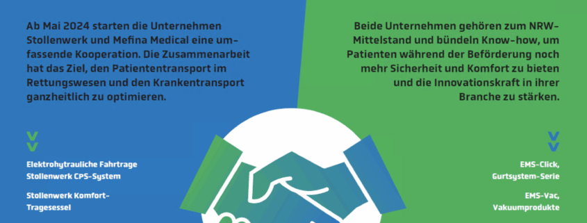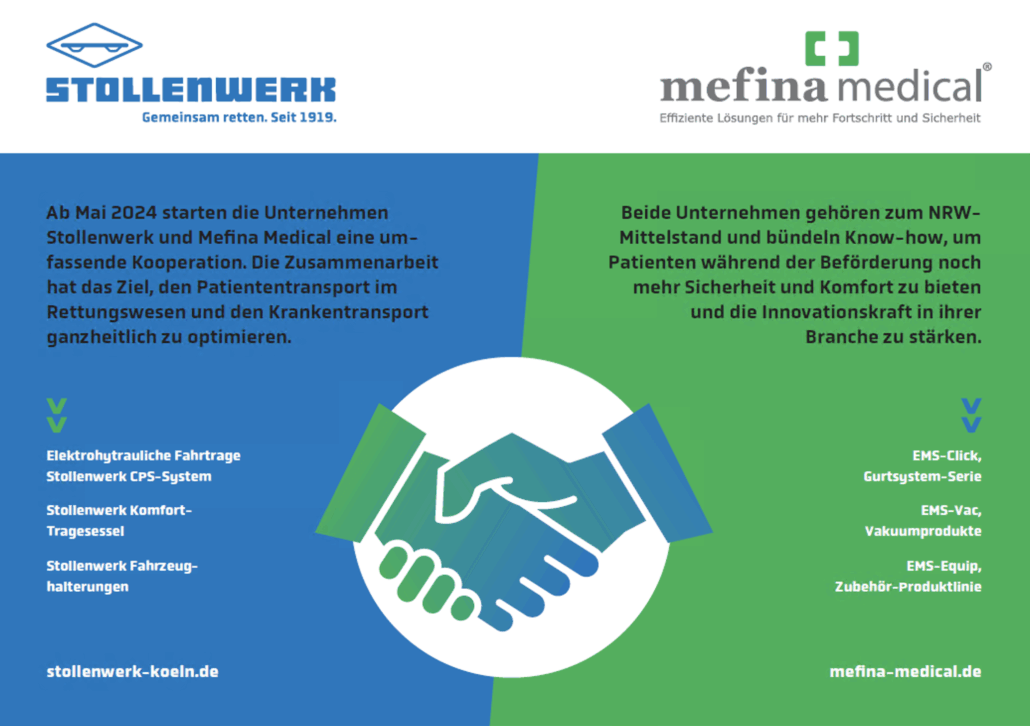 Ab 2024 starten die Unternehmen Stollenwerk und Mefina Medical eine umfassende Kooperation. Die Zusammenarbeit hat das Ziel, den Patiententransport ganzheitlich sowie insbesondere im Rettungswesen zu optimieren.