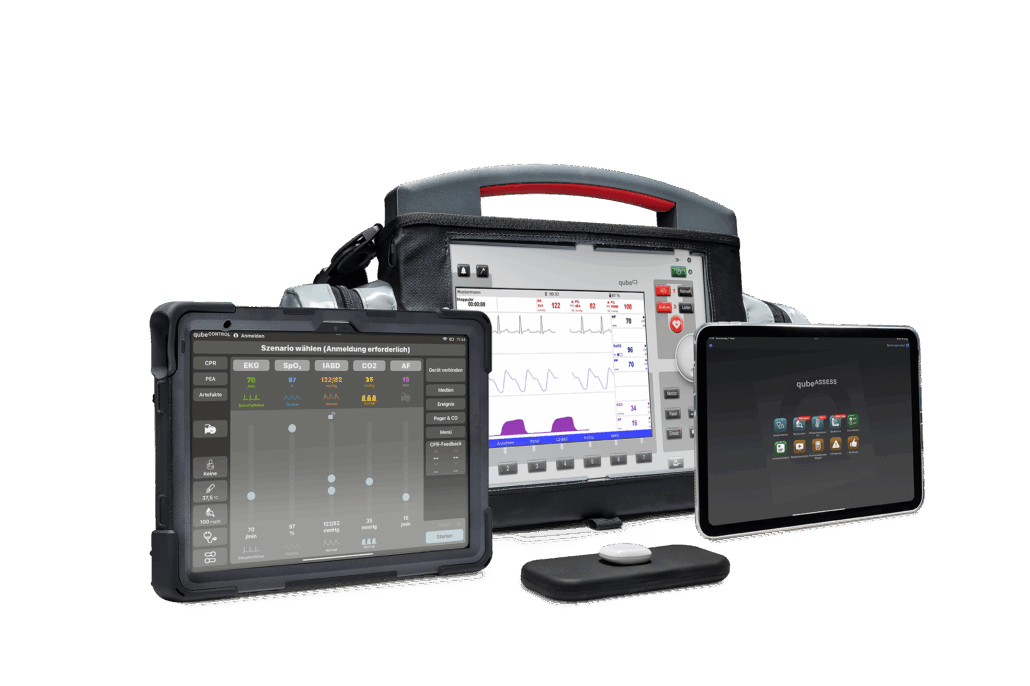 Das auf dem bekannten c³ basierende Simulationssystem qubeC3 – EKG-Patientensimulator besteht aus einem voll funktionsfähigen EKG-Monitor mit integrierter AED-Funktion, CPR-Feedback und einem dynamischen 12-Kanal-EKG, einer kabellosen Steuerungseinheit für Instruktoren sowie einem externen Skill-Trainer für Auskultation, Blutzucker- und Temperaturmessungen am Patienten.