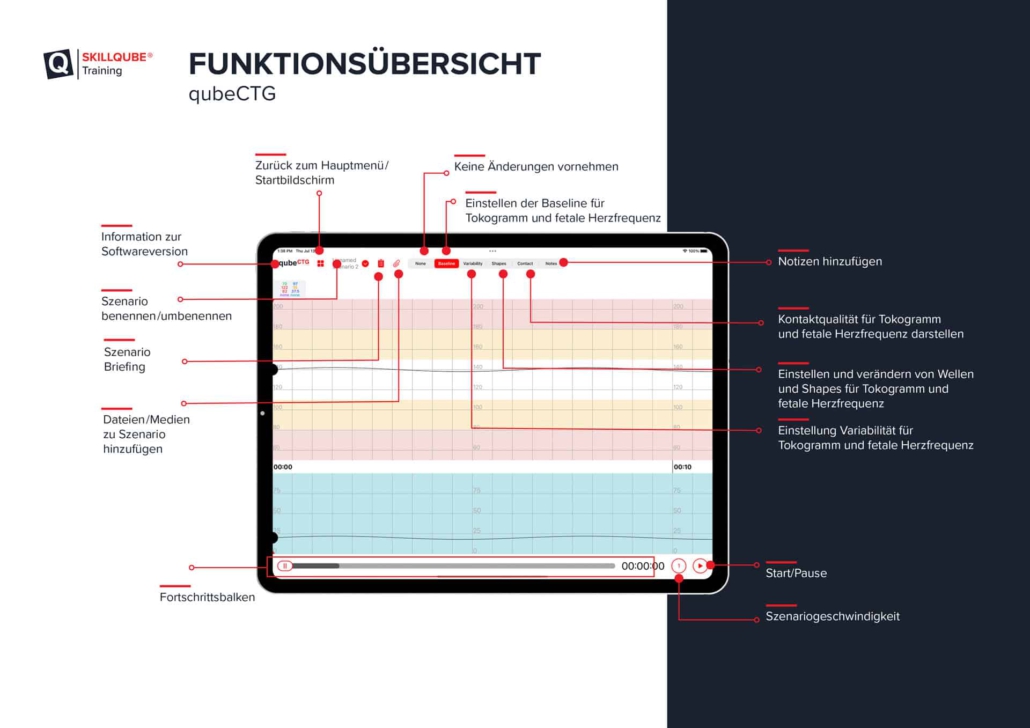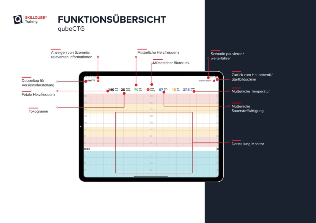 Das qubeCTG Tablet-basiertes Echtzeit-Kardiotokograph-Überwachungssystem zur Simulation in geburtshilflicher Umgebung. Mit dem neuen qubeCTG sind Sie in der Lage komplexe Geburtshilfliche Szenarien zu trainieren.