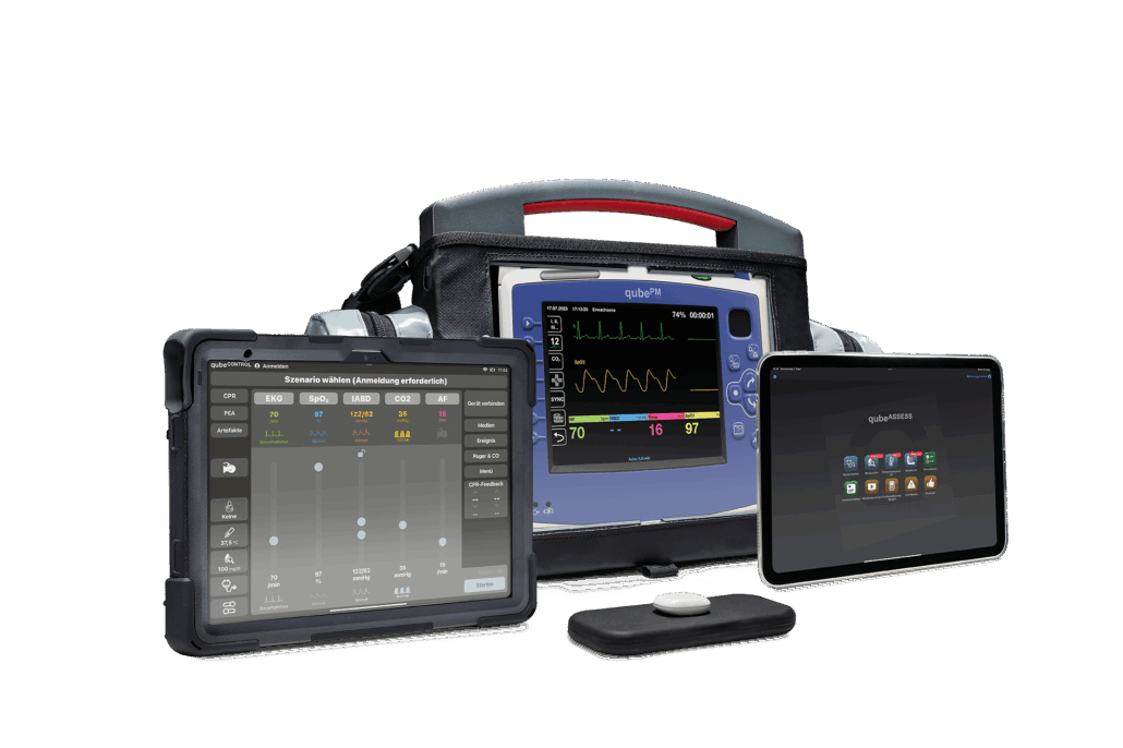 Der qubePM basiert auf dem „ZOLL® Propaq® M“ und unterstützt militärische und flugmedizinische Simulationstrainings. Das Tablet-basierte System bietet die volle Funktionalität des Echtgeräts, wie z. B. erweiterte physiologische Überwachung, einschließlich invasivem Blutdruck, dynamischem 12-Kanal-EKG und vielem mehr. Der qubePM kann in unseren qubeCONTROL, qubeCLOUD und qubeASSESSMENT integriert werden, um eine möglichst realistische Simulation zu ermöglichen.