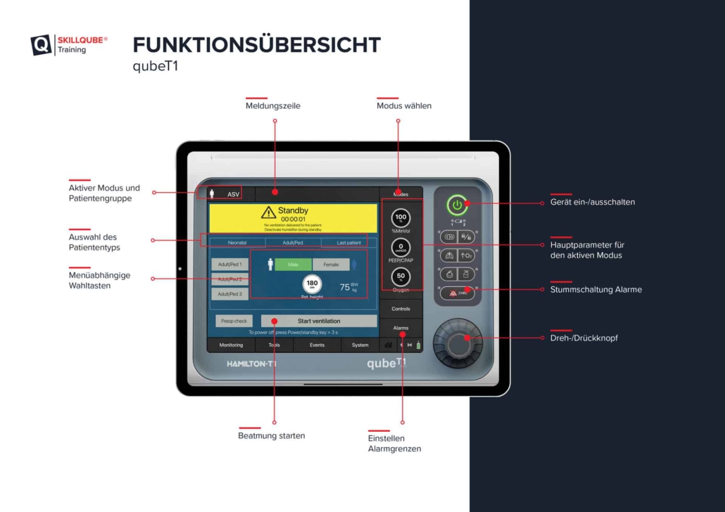 Der qubeT1 simuliert den Hamilton T1 und wurde gemeinsam mit Hamilton Medical entwickelt. Das Beatmungssimulationsystem qubeT1 ist die ideale ergänzung für die EKG-Simulatoren aus der qubeSERIE und ermöglicht ein anspruchsvolles Training mit hoher realitätsnähe getreu unserem Motto #machesecht. Den qubeT1 zeichnet inbesondere der verfügbare Beatmungsmodus ASV aus.